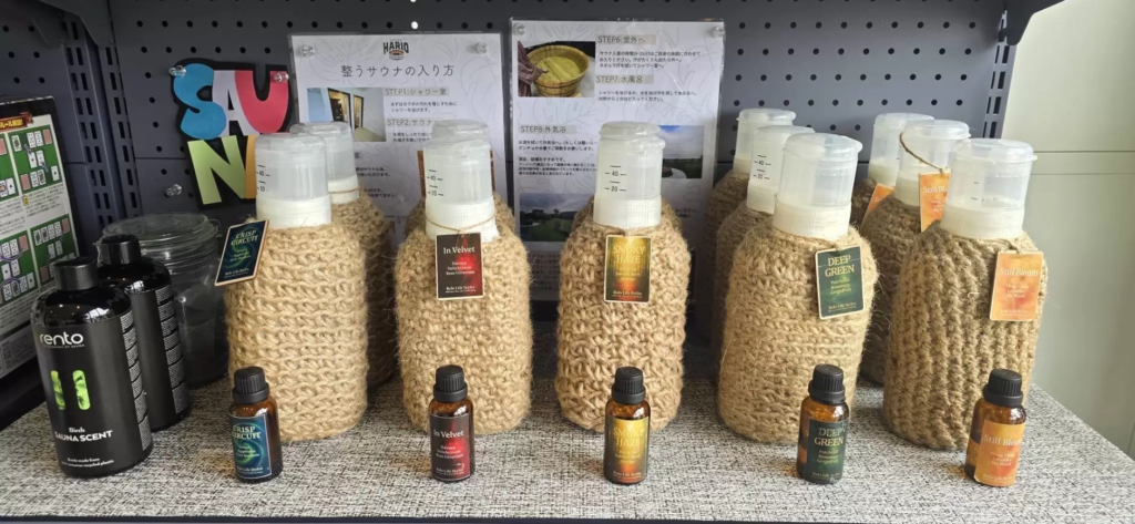 針尾ビーチウォークでは、ロウリュウに自社製の100%オーガニックアロマを使用しています。香りはサウナ体験の印象を大きく左右するからこそ、原料選びからブレンドまで妥協はありません。